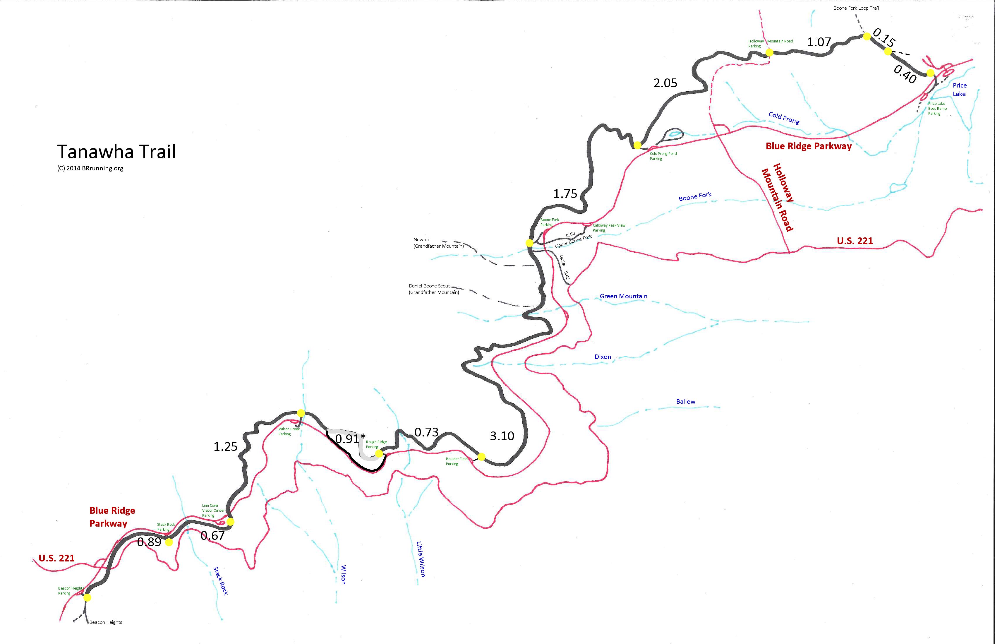 Tanawha Trail Total distance of 13.05 miles, with a detour around Rough Ridge, as detailed below. Following are one-way distances along the main trail.